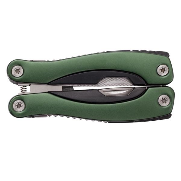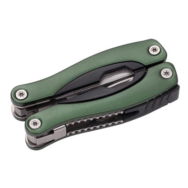 Narzędzie 9-funkcyjne pakowane w poliestrowe etui. Ostrza wykonane ze stali nierdzewnej. Narzędzie zawiera: piłę, wkrętaki płaskie, otwieracz do konserw, pilnik, szczypce uniwersalne, skrobak do ryb z końcówką do haczyków wędkarskich, otwieracz do butelek, wkrętak PH krzyżakowy, nóż.
