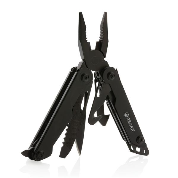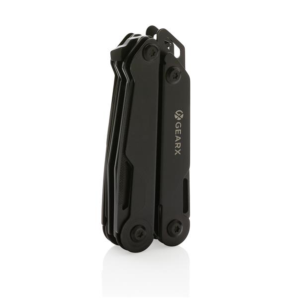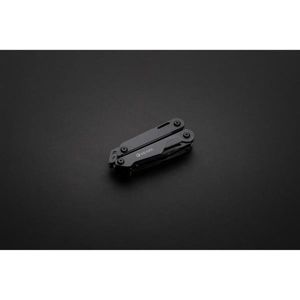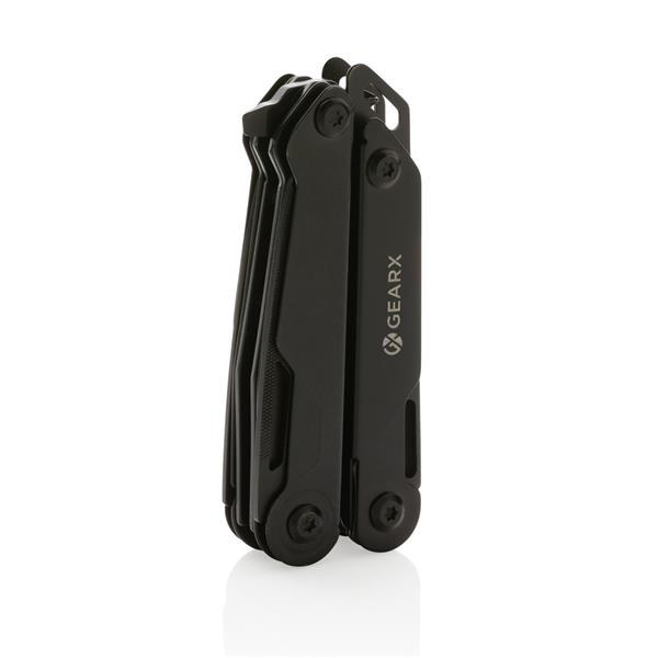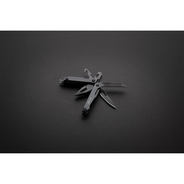Narzędzie wielofunkcyjne, aluminiowa obudowa, narzędzia wykonane z wytrzymałej stali nierdzewnej 420, funkcje: nóż z blokadą, pilnik, piła, duży śrubokręt płaski z blokadą, śrubokręt krzyżakowy, śrubokręt płaski, szczypce, kombinerki, przecinak do kabli i drutu, otwieracz do butelek, śrubokręt, przecinak do pasów, otwieracz do kartonów, w pudełku podarunkowym, ślad węglowy produktu: 3,08 kg CO2