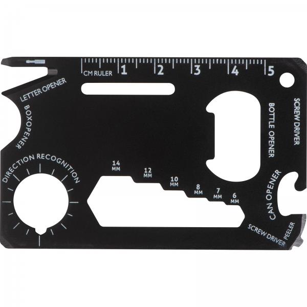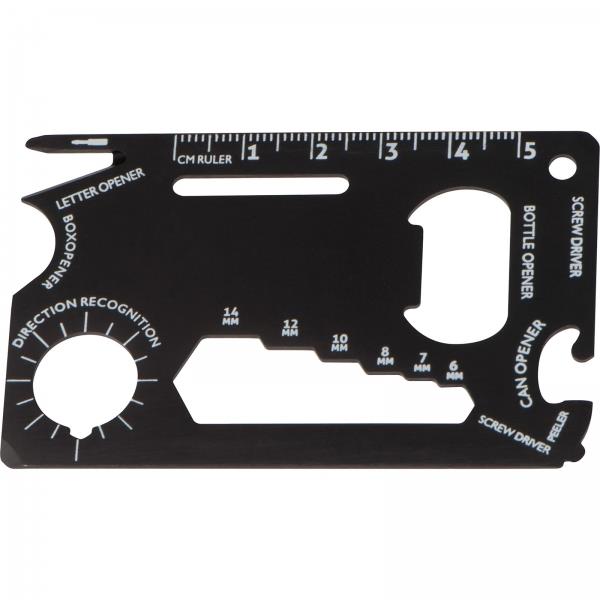 Karta survivalowa wykonana z aluminium. Zawiera: linijkę, otwieracz do butelek, otwieracz do puszek, śrubokręt, Logotyp można umieścić bezpośrednio na produkcie.