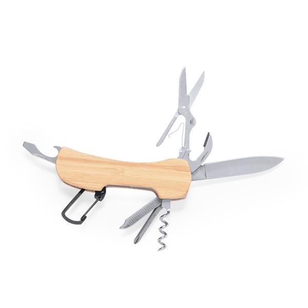 Narzędzie wielofunkcyjne, nóż wielofunkcyjny, scyzoryk, 9 funkcji, nożyce, otwieracz do puszek, otwieracz do butelek, płaski śrubokręt, korkociąg, śrubokręt krzyżakowy, pilnik do paznokci, bambusowy uchwyt