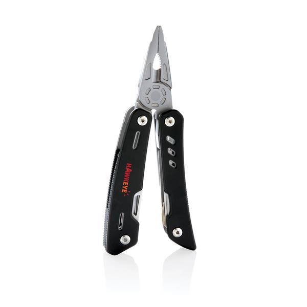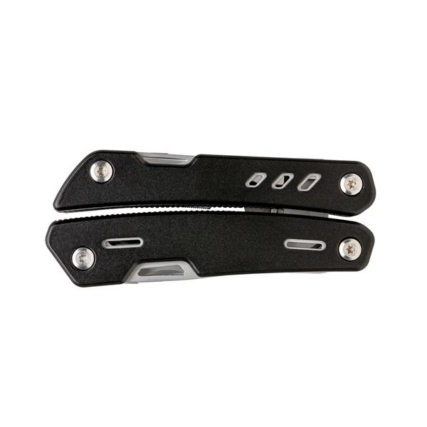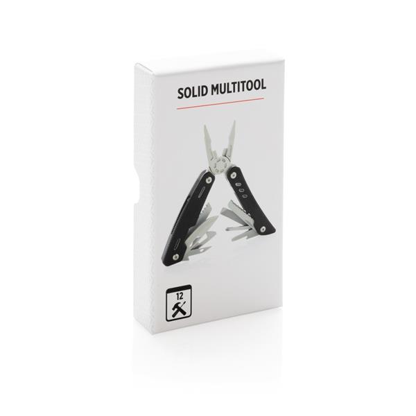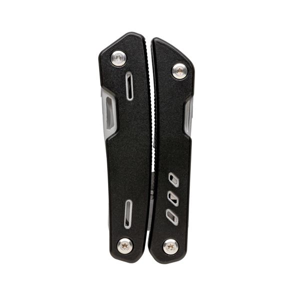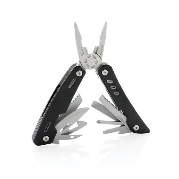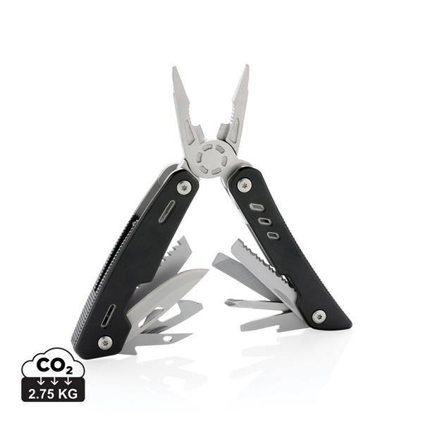 Narzędzie wielofunkcyjne, trwałe i wytrzymałe, wykonane ze stali nierdzewnej, aluminiowy uchwyt, 12 funkcji: szczypce, kombinerki, przecinak do kabli i drutu, nóż, śrubokręt krzyżakowy, mały śrubokręt płaski, piła, otwieracz do puszek, otwieracz do butelek, ostrze ząbkowane, szpikulec, pilnik i duży śrubokręt płaski, w ozdobnym pudełku, ślad węglowy produktu: 2,75 kg CO2