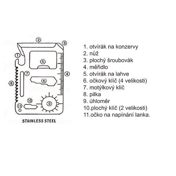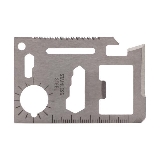 Metalowe narzędzie w kształcie karty. Pakowane w etui z ekoskóry. Ostrza wykonane ze stali nierdzewnej. Narzędzie zawiera: otwieracz do konserw, nóż, wkrętak płaski,miarkę, otwieracz do butelek, klucz oczkowy – 4 rozmiary, klucz do nakrętek motylkowych, piłę, kątomierz, klucz płaski – 2 rozmiary, remizę do troczenia/klucz do zaginania drutu.