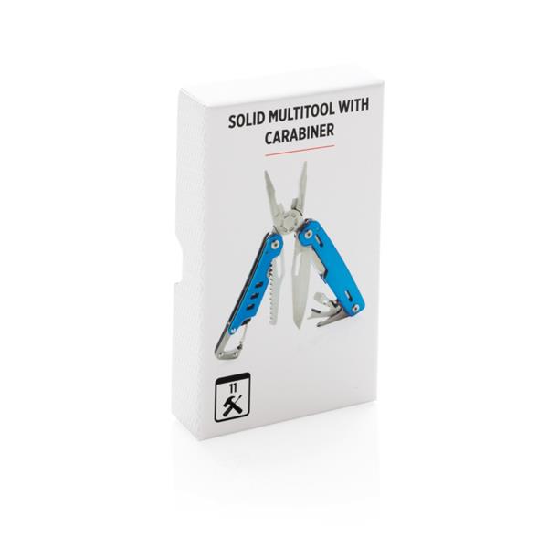 Trwałe i wytrzymałe narzędzie wielofunkcyjne, wykonane ze stali nierdzewnej, aluminiowy uchwyt, 11 funkcji: szczypce, kombinerki, przecinak do kabli i drutu, nóż, śrubokręt krzyżakowy, śrubokręt płaski, piła, otwieracz do puszek, otwieracz do butelek, urządzenie do usuwania izolacji z kabli, karabińczyk, w ozdobnym pudełku, ślad węglowy produktu: 2,63 kg CO2