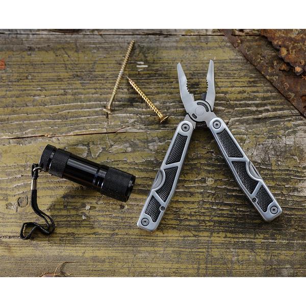 Zestaw składający się z 11-funkcyjnego multitoola i 9-diodowej latarki w opakowaniu upominkowym. Ostrza wykonane ze stali nierdzewnej. Multitool posiada antypoślizgowe okładziny z tworzywa ABS. Zawiera: szczypce uniwersalne, okładziny antypoślizgowe, szydło, wkrętaki płaskie, otwieracz do butelek, nóż, skrobak do ryb z końcówką do haczyków wędkarskich, pilnik, piłę, wkrętak PH krzyżowy, otwieracz do konserw. Do zestawu dołączone są baterie – 3 x AAA.