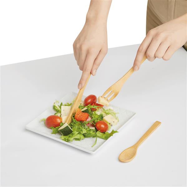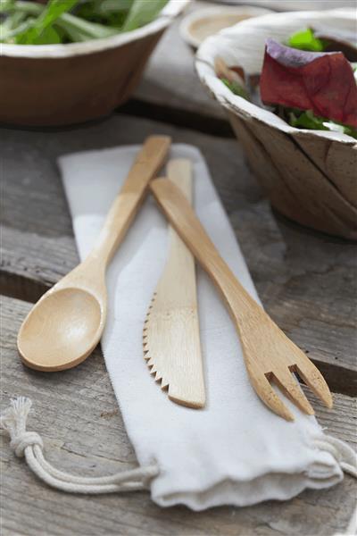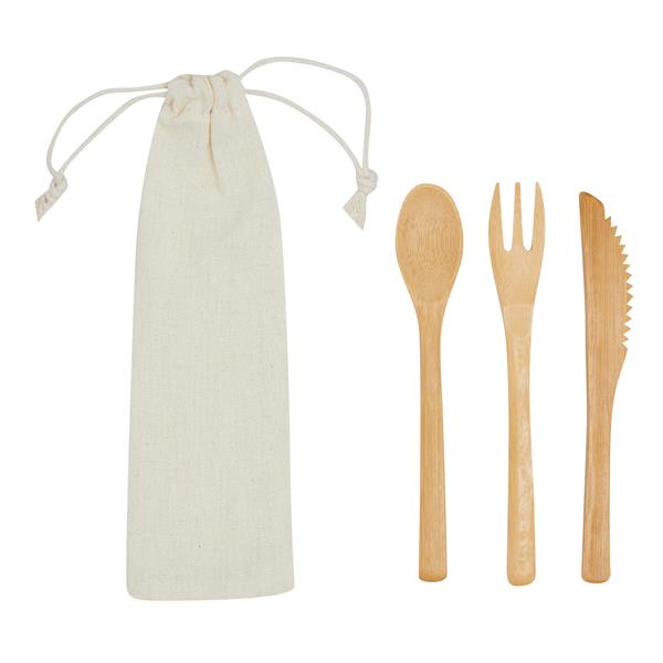 Zestaw sztućców bambusowych NATURAL TRIP, w zestawie nóż, widelec i łyżka. Zapakowany w bawełnianą torbę.