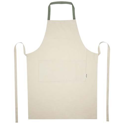Nia fartuch wykonany w 100% z bawełny pochodzącej z recyklingu o gramaturze 200 g/m2 z certyfikatem GRS. Dzięki naturalnemu kolorowi bawełny i kontrastowej pętli na szyję, fartuch ten ochroni Twoje ubrania podczas gotowania. Nia fartuch z dwoma przylegającymi do siebie kieszeniami o łącznych wymiarach 45 x 20 cm i wiązaniu z tyłu o długości 1 metra zapewnia jest zarówno praktyczny, jak i stylowy podczas pracy w kuchni.