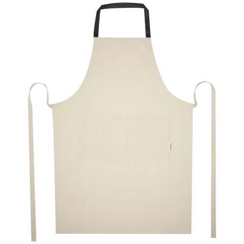 Nia fartuch wykonany w 100% z bawełny pochodzącej z recyklingu o gramaturze 200 g/m2 z certyfikatem GRS. Dzięki naturalnemu kolorowi bawełny i kontrastowej pętli na szyję, fartuch ten ochroni Twoje ubrania podczas gotowania. Nia fartuch z dwoma przylegającymi do siebie kieszeniami o łącznych wymiarach 45 x 20 cm i wiązaniu z tyłu o długości 1 metra zapewnia jest zarówno praktyczny, jak i stylowy podczas pracy w kuchni.