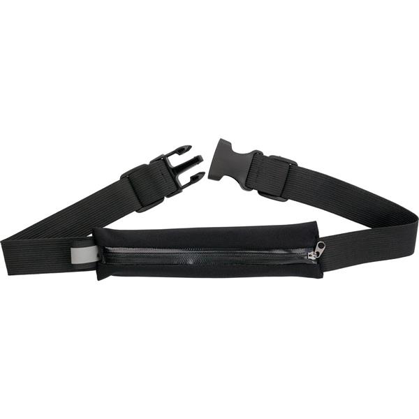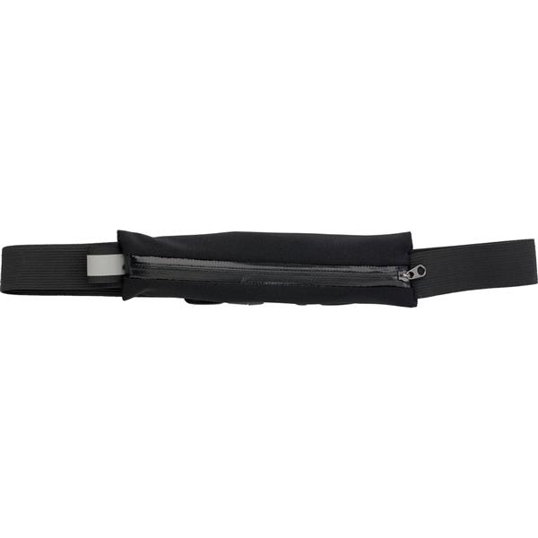 Nieprzemakalna saszetka zapinana w pasie na zamek, regulowany gumowy pasek z obu stron (2 x 27 cm) z plastikowym zapięciem, min. obwód ok. 62 cm, max. obwód ok. 93 cm (plus rozciągnięcie)