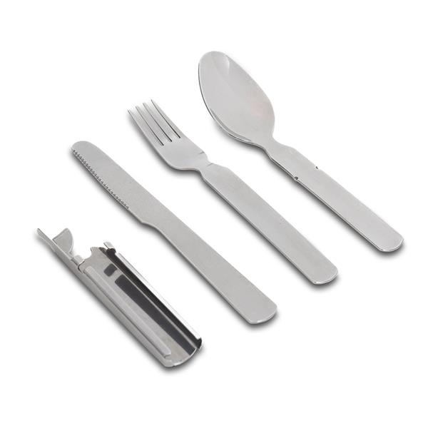 Praktyczny, czteroczęściowy niezbędnik ze stali nierdzewnej w pokrowcu. Świetnie nadaje się na wyjazdy survivalowe lub camping. W skład zestawu wchodzą sztućce: nóż, widelec, łyżka oraz otwieracz do konserw i otwieracz do kapsli. Kompaktowa konstrukcja, która łączy ze sobą wszystkie części, zapewnia łatwe przechowywanie.