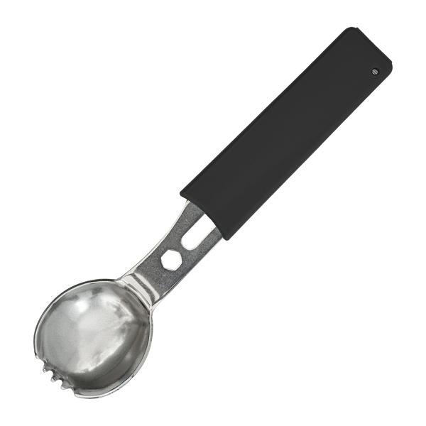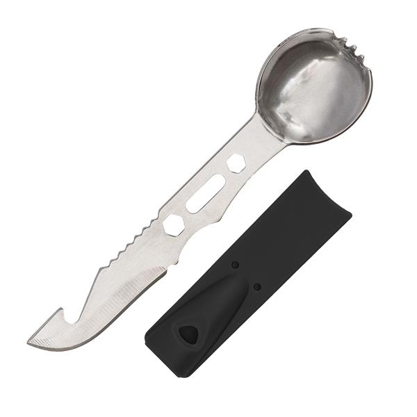 Niezbędnik ze stali nierdzewnej. Posiada 8 funkcji: łyżkę, widelec, nóż, otwieracz do butelek, skrobak do ryb, 2 klucze hexagonalne i gwizdek ostrzegawczy, który jest jednocześnie futerałem. Przydatny podczas wędrówek i biwaków.