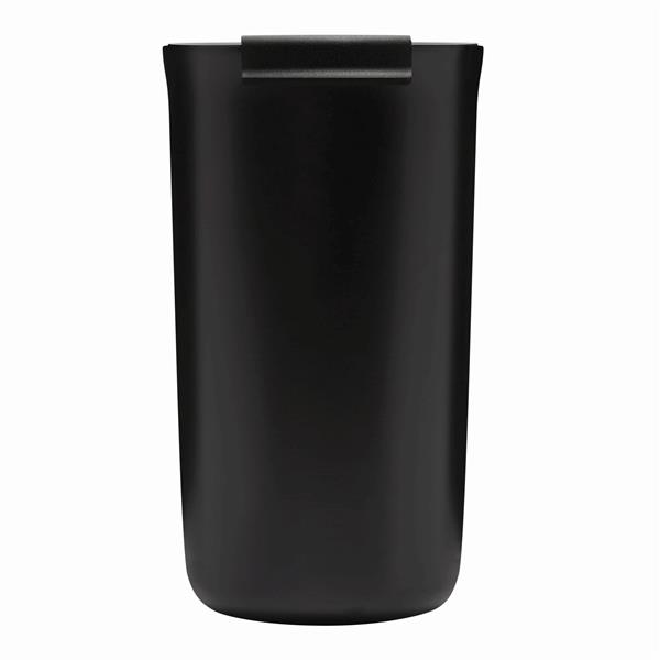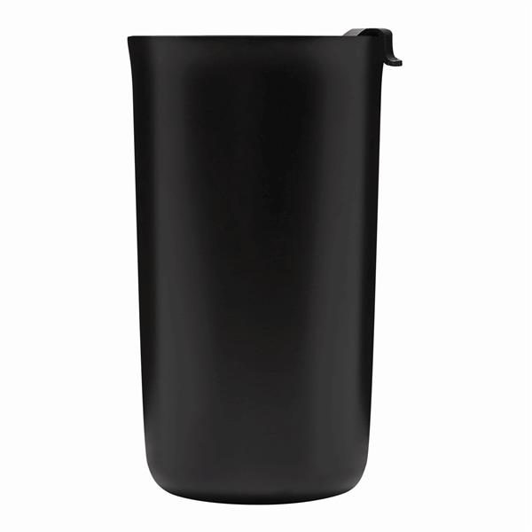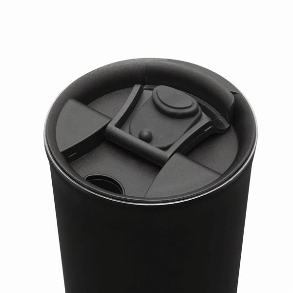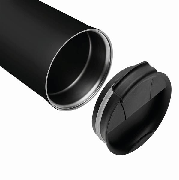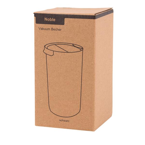 Próżniowy kubek do picia NOBLE, dwuścienny: wewnątrz i na zewnątrz ze stali nierdzewnej, pokrywka z tworzywa sztucznego z silikonową uszczelką i zintegrowanym otworem do picia na zatrzask, pojemność ok. 450 ml, utrzymuje ciepło do 8 godzin i zimno do 12 godzin.
