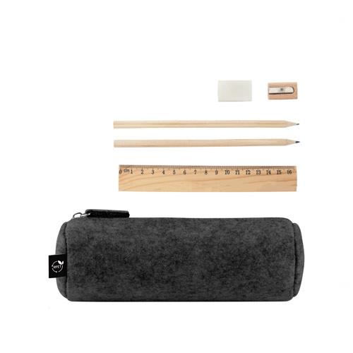 Wielofunkcyjne etui z filcu pochodzącego z recyklingu (100% rPET) o cylindrycznym kształcie i zapinane na zamek błyskawiczny. Zawiera linijkę 16.5 cm, 2 ołówki grafitowe (HB), 1 gumkę i 1 temperówkę. Torba: O70 x 210 mm