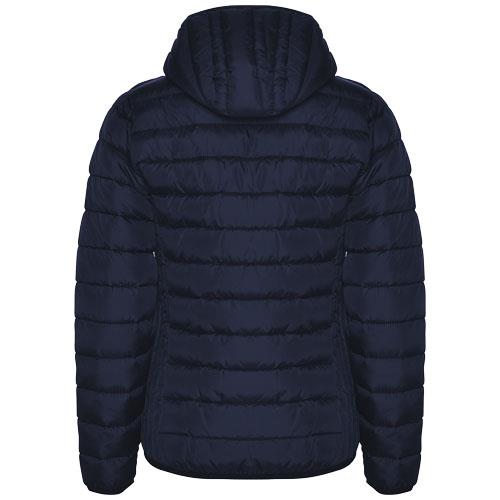 Damska pikowana kurtka z dopasowanym kapturem z materiału przypominającego w dotyku pierze. Odwrócone zamki błyskawiczne z dopasowaną osłoną podbródka. Dwie przednie kieszenie zapinane na zamek. Dopasowane elastyczne wykończenia mankietów, dołu i kaptura. Kontrastowa wewnętrzna podszewka. Dołączona torba transportowa. Lekka i składana odzież. Dopasowany krój. Wodoodporna. Model wiatroszczelny.