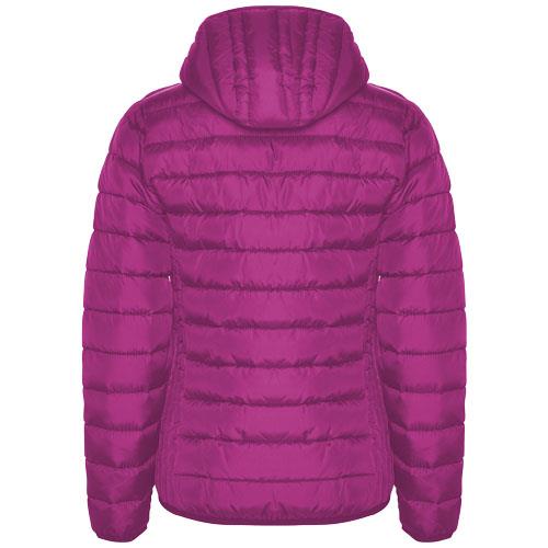 Damska pikowana kurtka z dopasowanym kapturem z materiału przypominającego w dotyku pierze. Odwrócone zamki błyskawiczne z dopasowaną osłoną podbródka. Dwie przednie kieszenie zapinane na zamek. Dopasowane elastyczne wykończenia mankietów, dołu i kaptura. Kontrastowa wewnętrzna podszewka. Dołączona torba transportowa. Lekka i składana odzież. Dopasowany krój. Wodoodporna. Model wiatroszczelny.