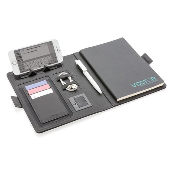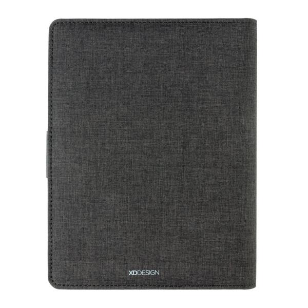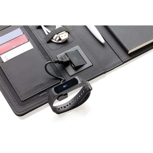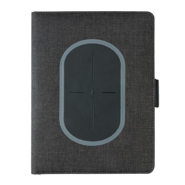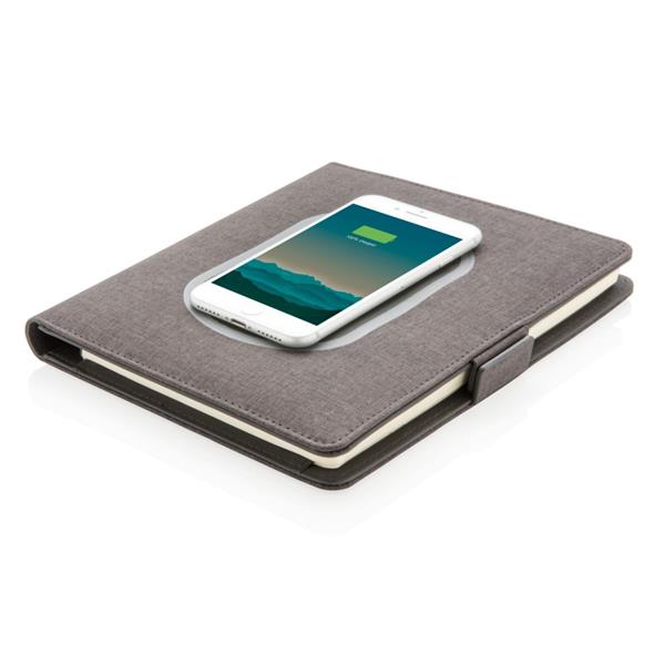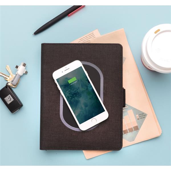 Notatnik A5 (64 kartki 80 g/m2 w linie), bezprzewodowy power bank 4000 mAh, ładowarka bezprzewodowa 5W, okładka wielokrotnego użytku, posiada porty USB do ładowania za pomocą kabla wysuwające się po naciśnięciu przycisku, bezprzewodowe ładowanie jest kompatybilne ze wszystkimi urządzeniami posiadającymi możliwość ładowania indukcyjnego, wejście 5V/1A, wyjście 5V/2.1A, wyjście bezprzewodowe 5W, po zapisaniu wszystkich stron okładkę można użyć ponownie, wystarczy wymienić notatnik na nowy, wzór zastrzeżony ®, ślad węglowy produktu: 3,84 kg CO2
