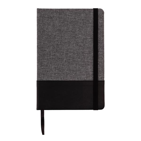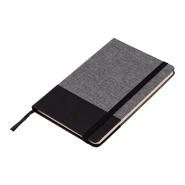 Notatnik A5 w twardej oprawie pokrytej tkaniną i ekoskórą, z tasiemką do zaznaczania strony oraz elastyczną gumką chroniącą wnętrze. 80 kartek w linie, gramatura papieru 70 g/m2.