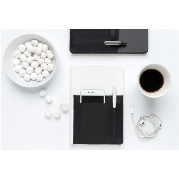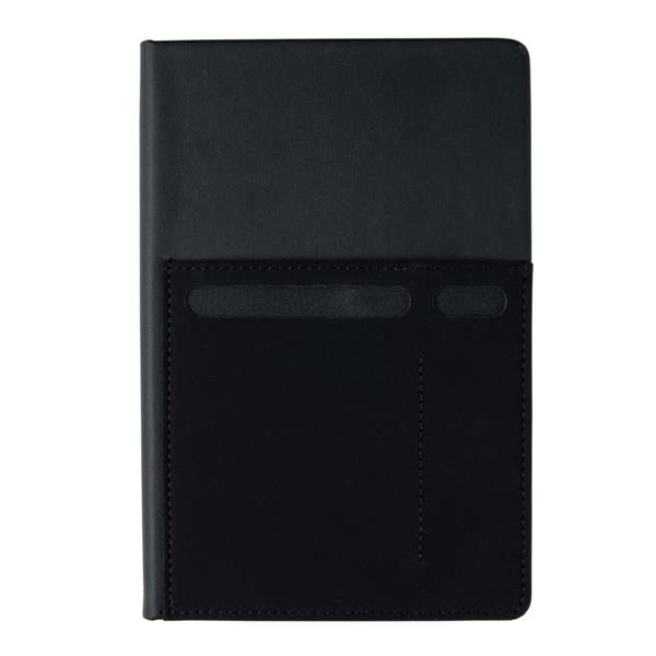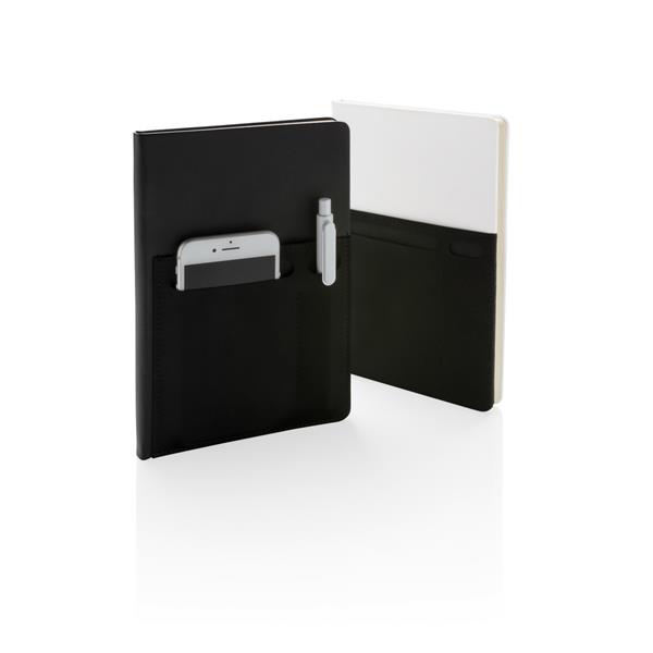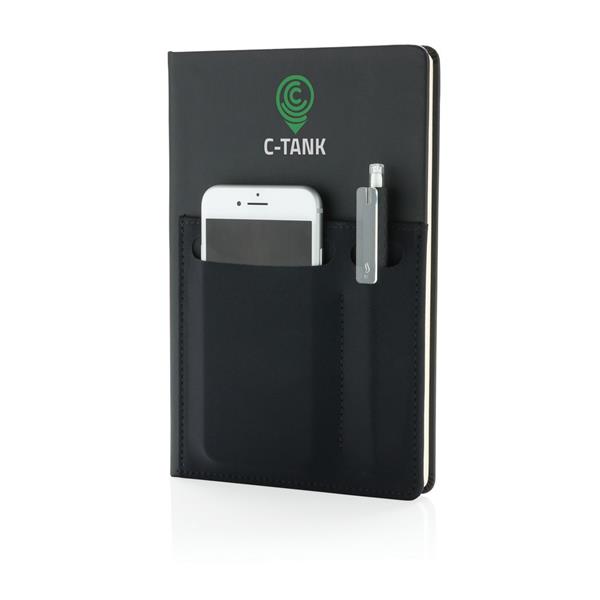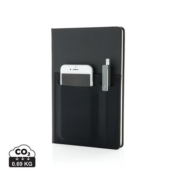 Notatnik A5 (80 kremowych kartek 80 g/m2 w linie), kieszenie na okładce, w tym na telefon (do 8 cm szerokości), miejsce na przybory do pisania, duża kieszeń na dokumenty, ślad węglowy produktu: 0,69 kg CO2