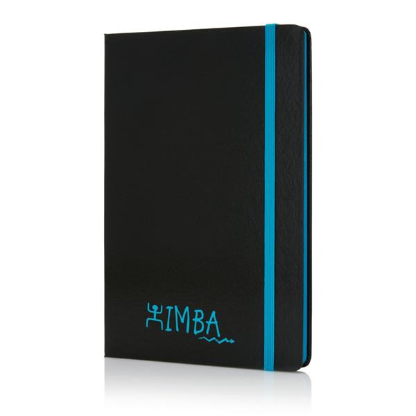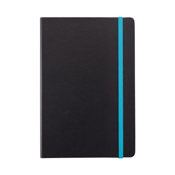 Notatnik A5 (80 kartek 80 g/m2 w linie), twarda okładka, boki stron w kolorze elastycznej opaski do zamykania, ślad węglowy produktu: 0,63 kg CO2