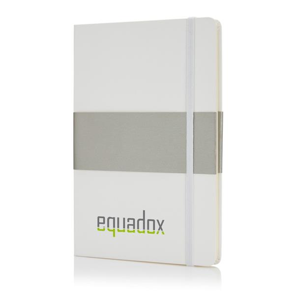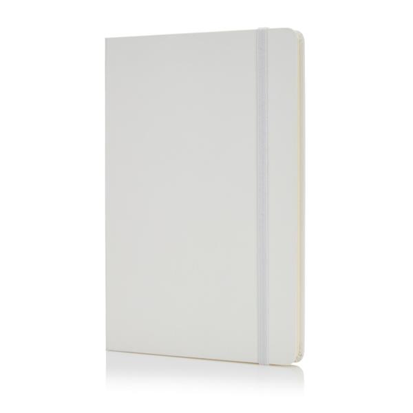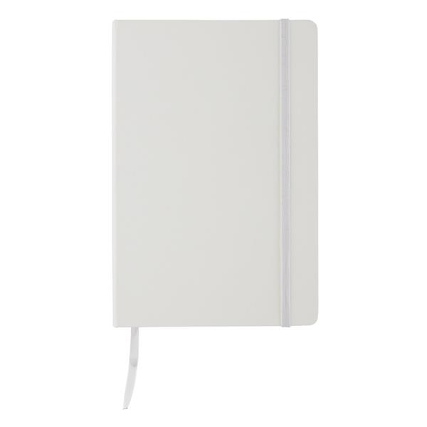 Notatnik A5 (80 kremowych kartek 80 g/m2 w linie), twarda okładka, tasiemka zakładkowa, elastyczna opaska do zamykania, obwoluta, zaokrąglone rogi, ślad węglowy produktu: 0,7 kg CO2