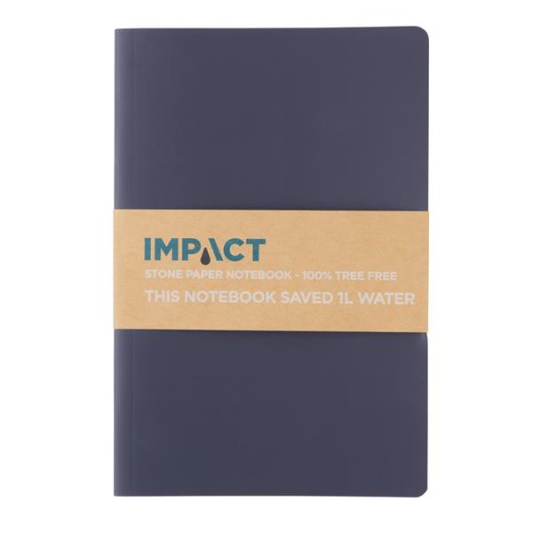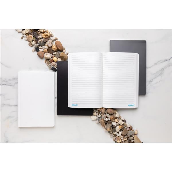 Notatnik A5 (60 białych kartek 58 g/m2 w linie), miękka okładka, notatnik wykonany z papieru kamiennego, który składa się w 80% z proszku mineralnego i 20% nietoksycznego HDPE (czysty plastik), 2% wpływów z każdego sprzedanego produktu z kolekcji Impact jest przekazywane na rzecz Water.org