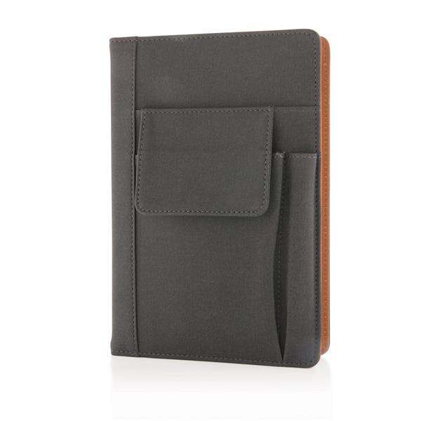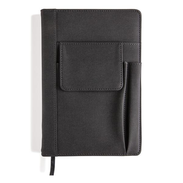 Notatnik A5 (80 kartek 80 g/m2 w linie), pokryta PU okładka wielokrotnego użytku, przednia kieszeń na telefon (14 x 10 cm), miejsce na przybory do pisania, czarna tasiemka zakładkowa, po zapisaniu wszystkich stron okładkę można użyć ponownie, wystarczy wymienić notatnik na nowy, ślad węglowy produktu: 1,16 kg CO2