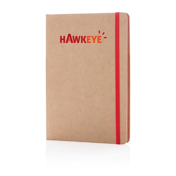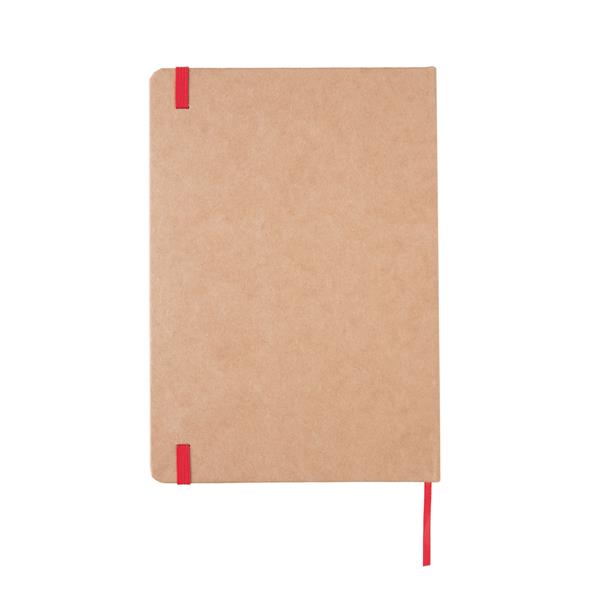 Notatnik A5 (72 kremowe kartki 70 g/m2 w linie), wykonany z papieru makulaturowego, tasiemka zakładkowa i elastyczna opaska do zamykania, ślad węglowy produktu: 0,52 kg CO2