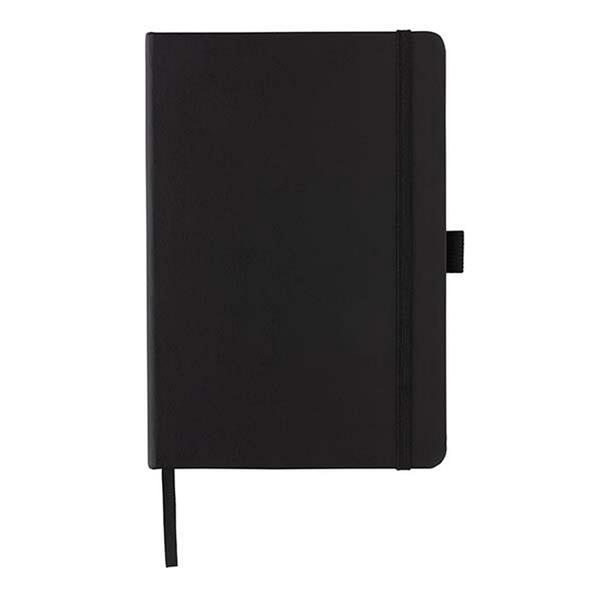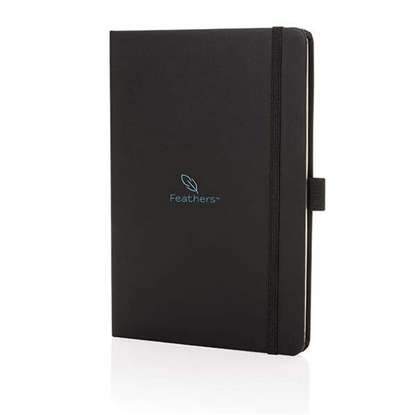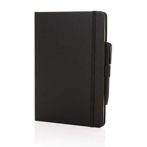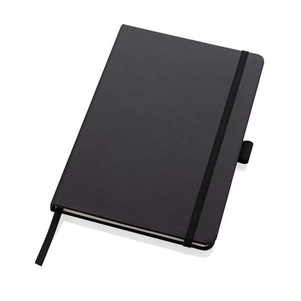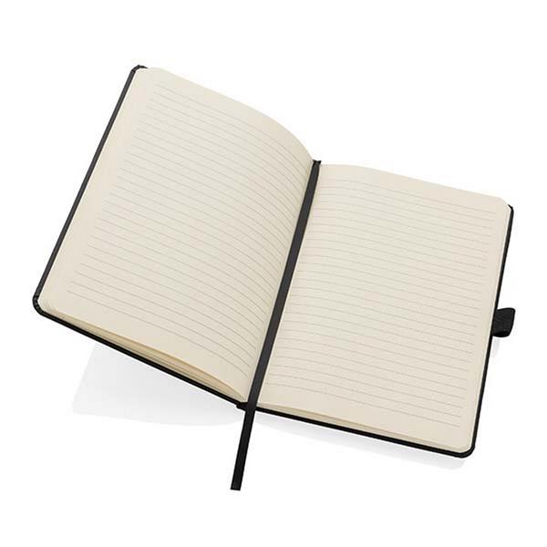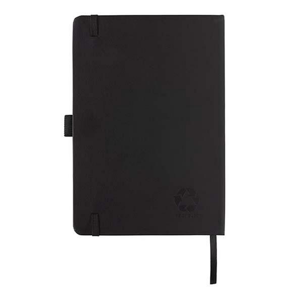Notatnik A5 (80 kartek w linie z papieru makulaturowego o gramaturze 70 g/m2), okładka wykonana ze skóry z recyklingu, pętla na długopis, elastyczna opaska do zamykania, całkowita zawartość materiałów z recyklingu obliczona na podstawie wagi produktu: 75%