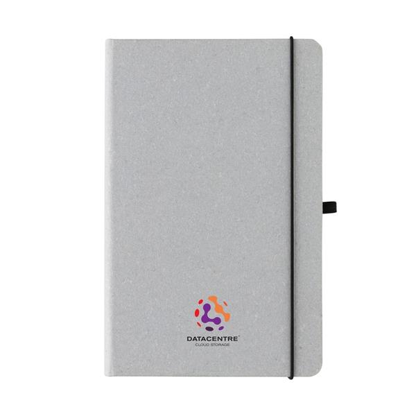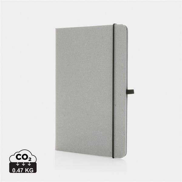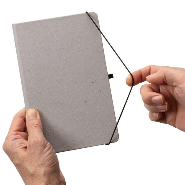 Notatnik A5 (80 białych kartek 70 g/m2 w linie), elastyczna opaska do zamykania, miejsce na przybory do pisania, okładka wykonana ze skóry pochodzącej z recyklingu