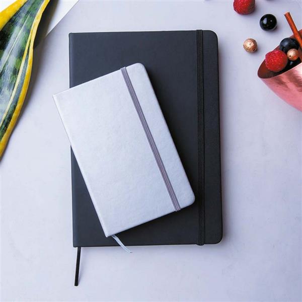 Notatnik w formacie A5, posiada 100 pustych kartek, twarda okładka, tasiemka zakładkowa umożliwia wygodne zaznaczanie ostatniej strony lub ważniejszych notatek, dodatkowe zamknięcie w postaci dopasowanej kolorystycznie elastycznej opaski, produkt wykonany z PU