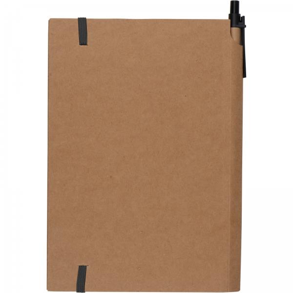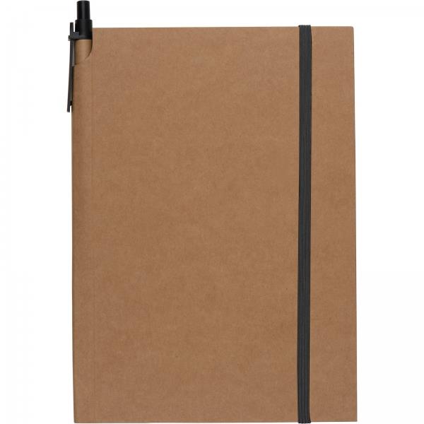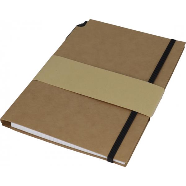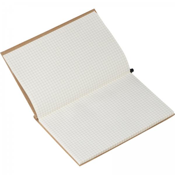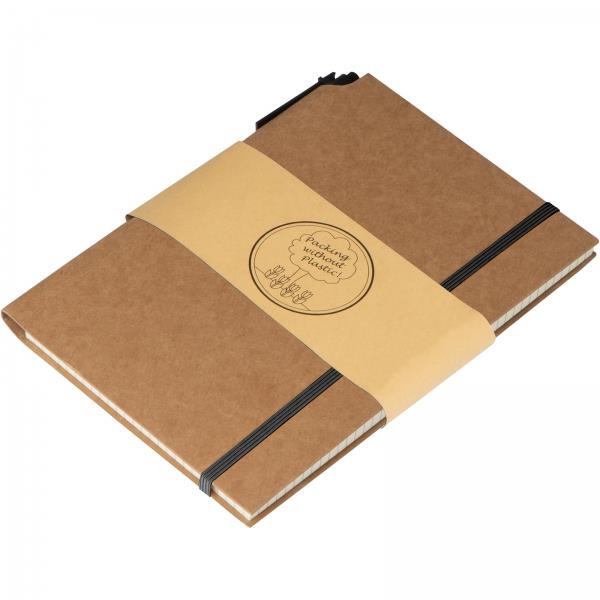 Notes (160 stron w kratkę) z ekologiczną okładką z kartonu i gumką. W zestawie z długopisem.