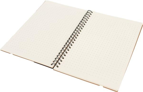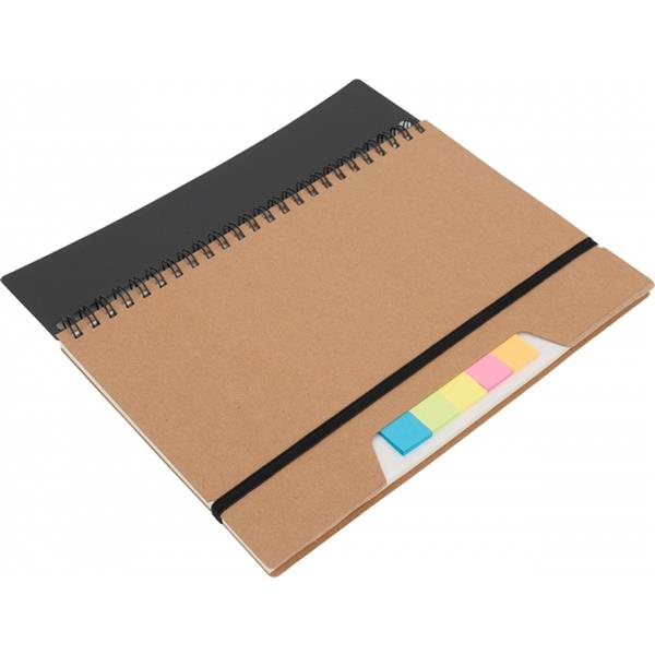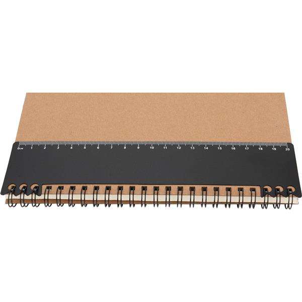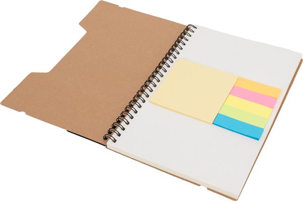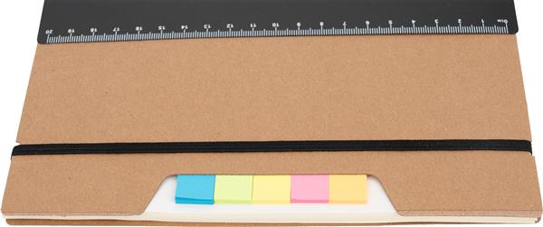 Notes A5 w kartonowej okładce z plastikową linijką, 120 stronami w kropki, karteczkami samoprzylepnymi i zamknięciem na gumkę.