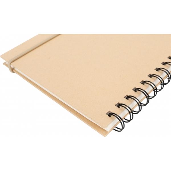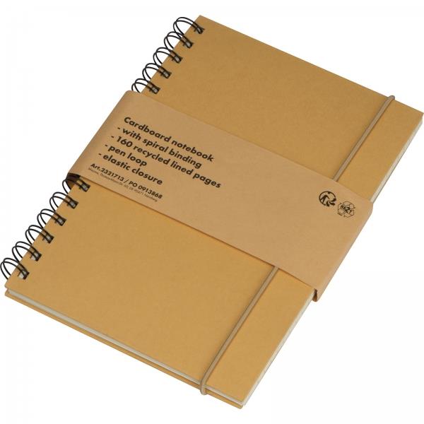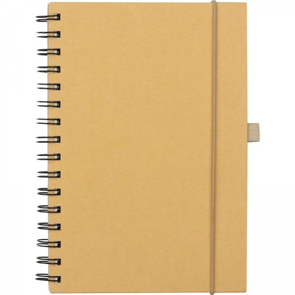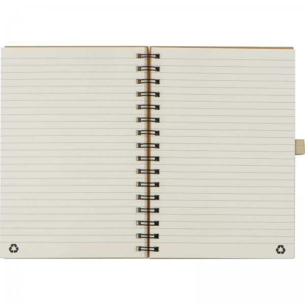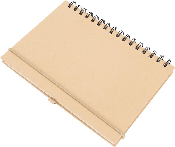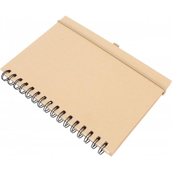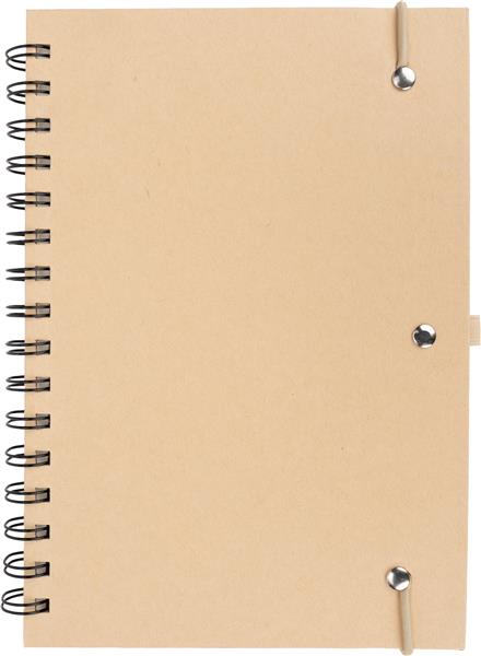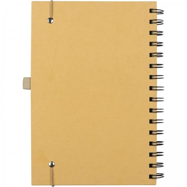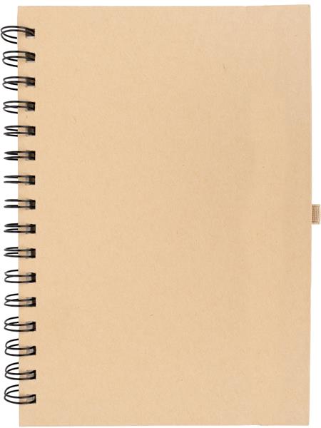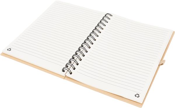 Notes o formacie A5 z kartkami w linie, wykonanymi z papieru pochodzącego z recyklingu. Posiada gumkę do zamykania i pętelkę na długopis.