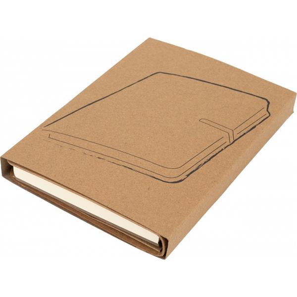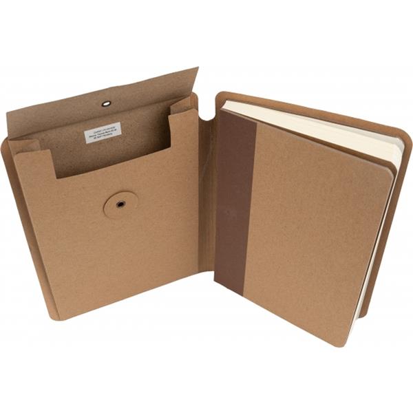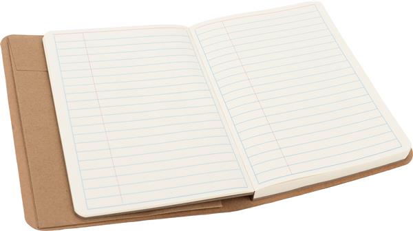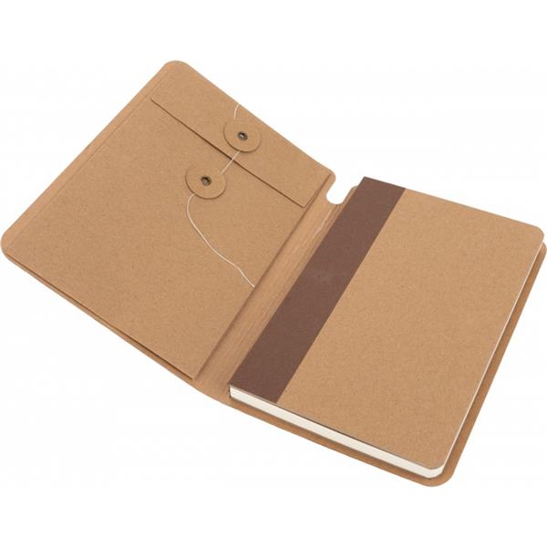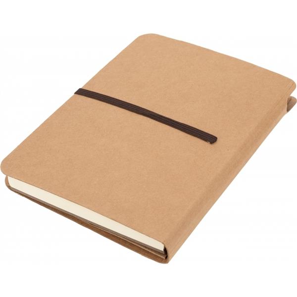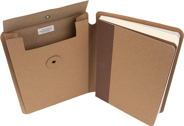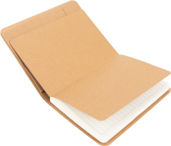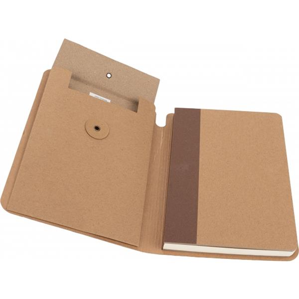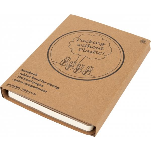 Ekologiczny notes w tekturowej okładce, zamykany na gumkę, posiada 120 stron w linie. Na wewnętrznej stronie okładki znajduje się dodatkowa zamykana kieszonka. Gramatura papieru 70g/m2.