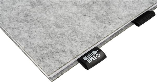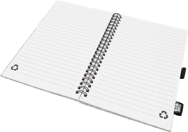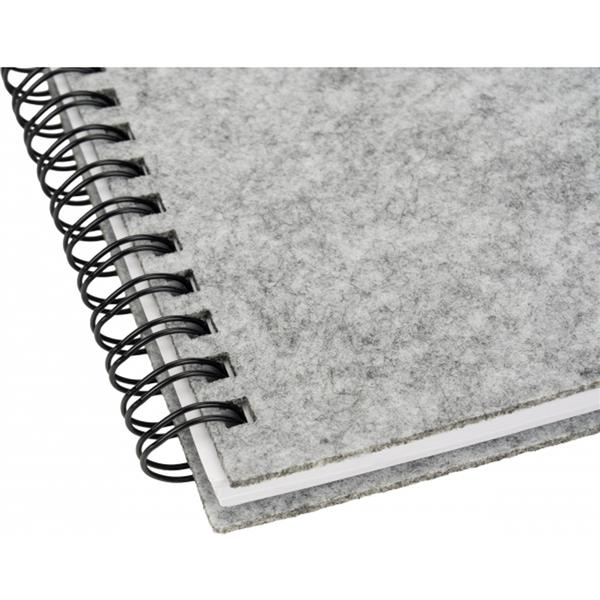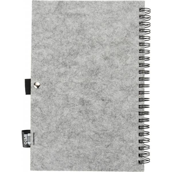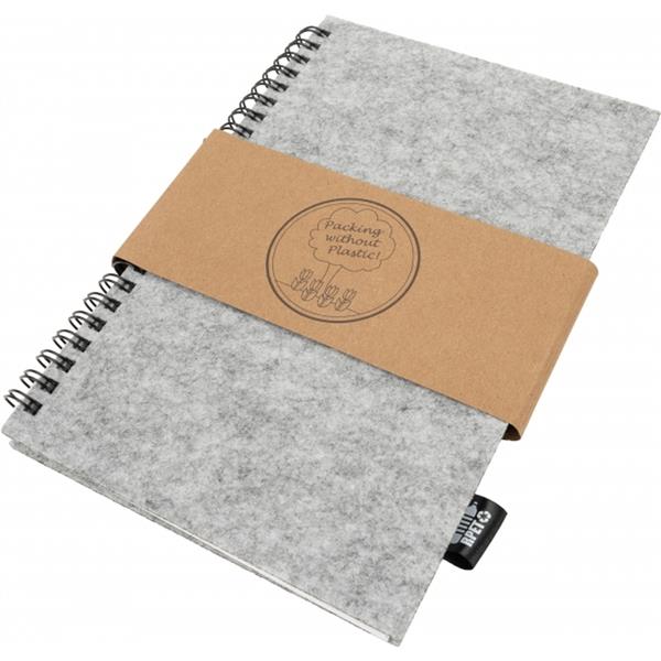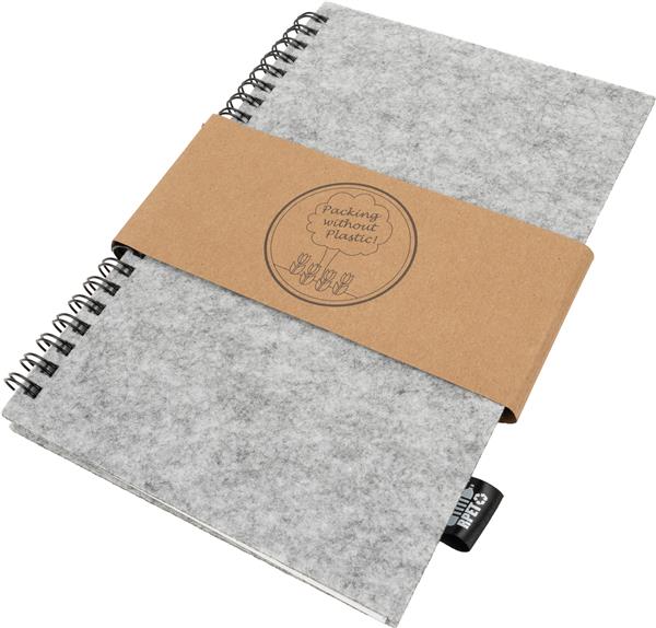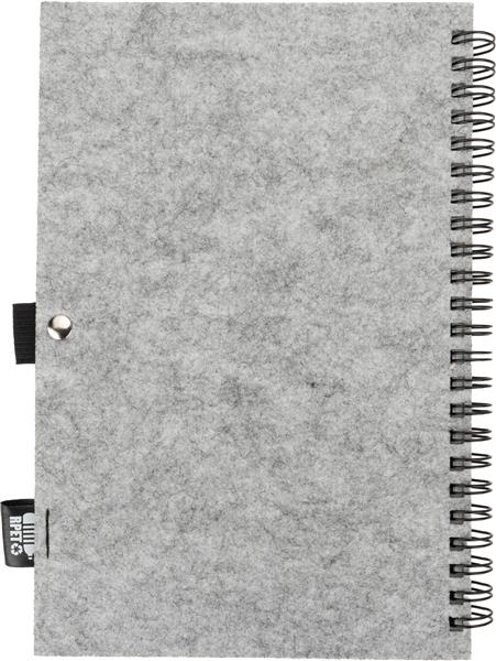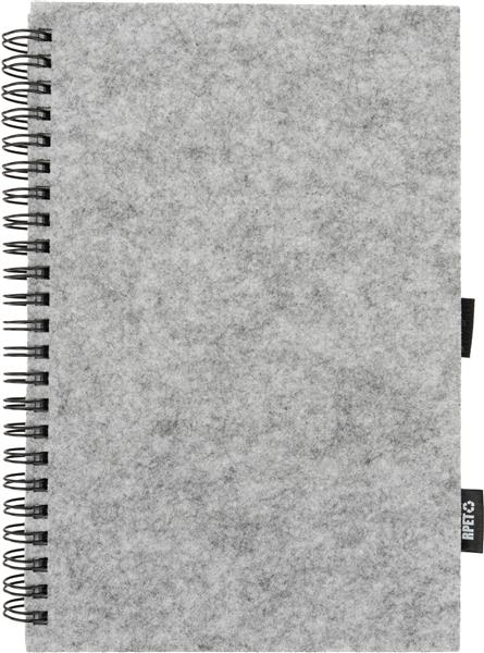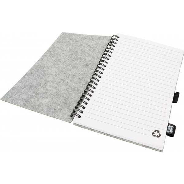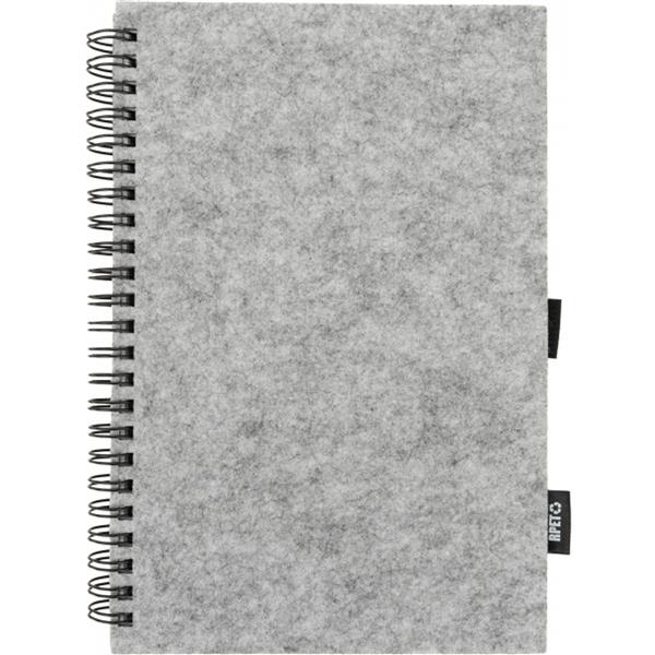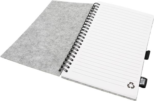 Notes wykonany z filcu RPET, o formacie A5 z 160 stronami w linie. Notes posiada spiralną oprawę i pętelkę na długopis.
