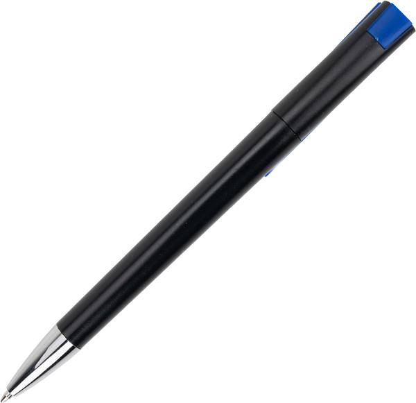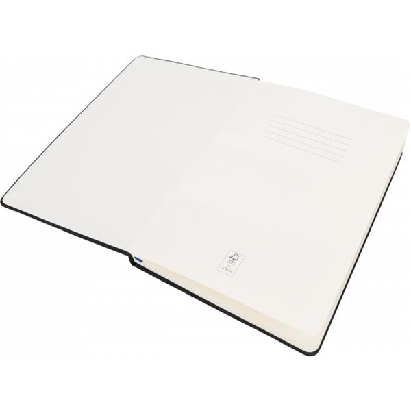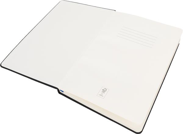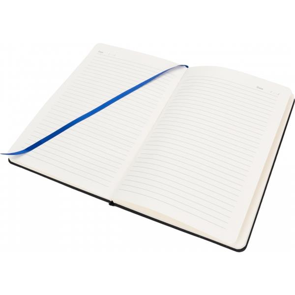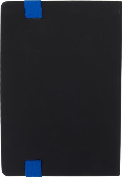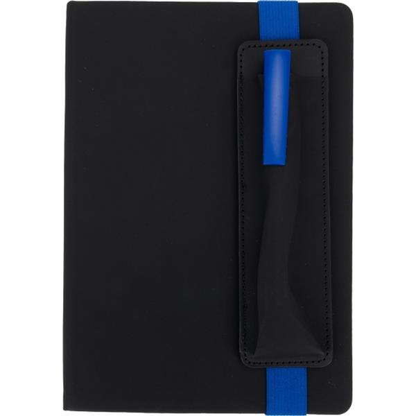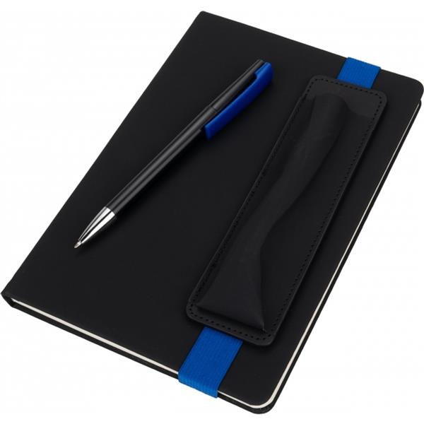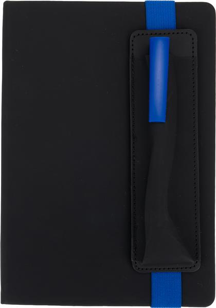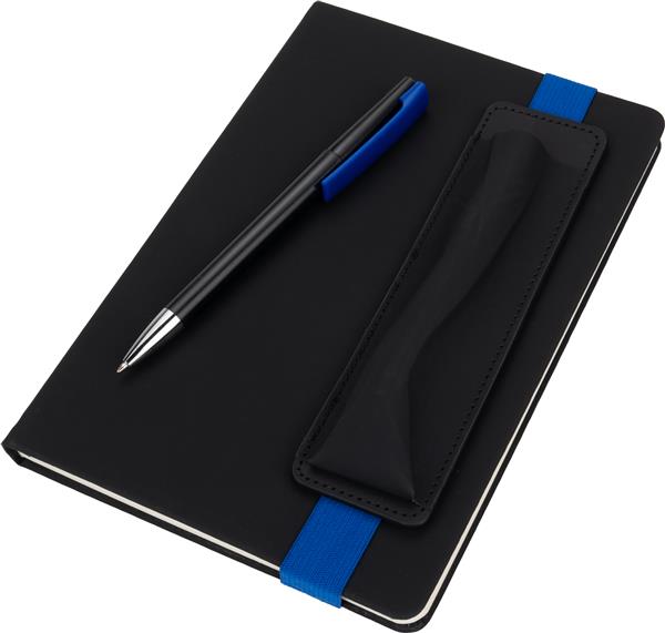 A5 notebook with a PU cover and 192 lined pages, a bookmark and an elastic band to close the notebook, with a pen holder included with the notebook – a pen made of ABS, writing in blue.
