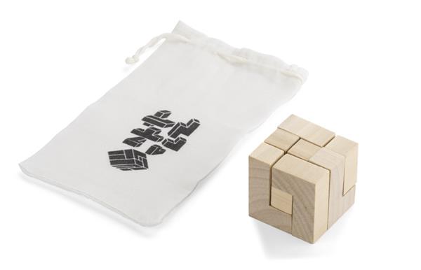 Mała układanka logiczna w bawełnianym woreczku. Układanka wykonana z drewna.