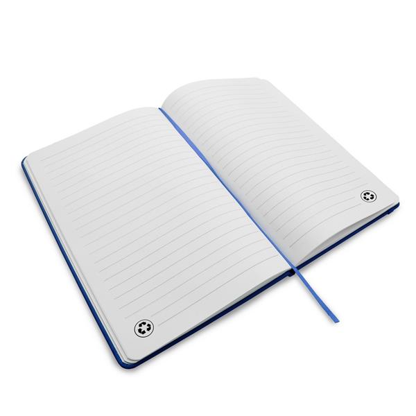 Notatnik w formacie A5, posiada 80 kartek w linie (160 stron), dodatkowe zamknięcie w postaci dopasowanej kolorystycznie elastycznej opaski, twarda okładka wykonana z PU z recyklingu, kartki z papieru z recyklingu