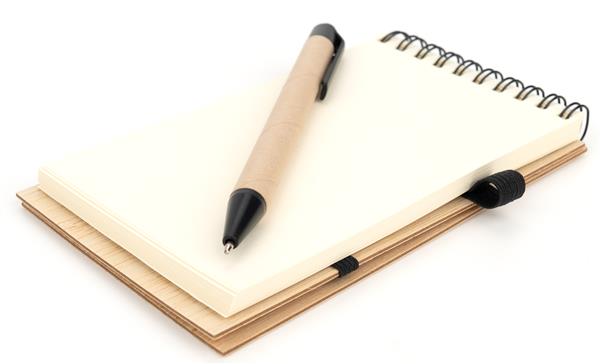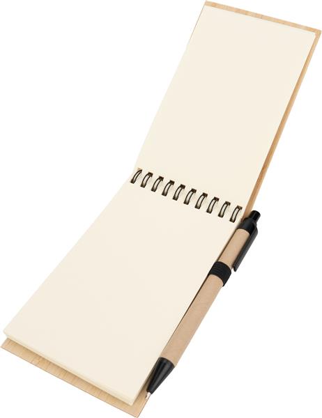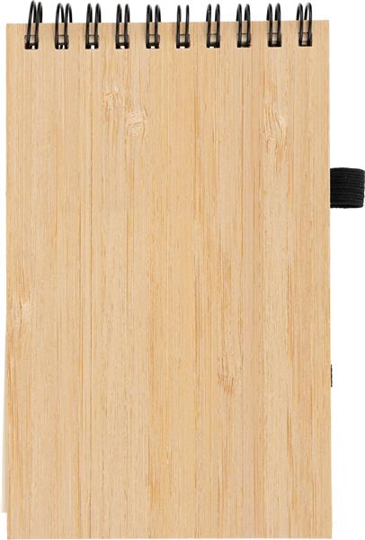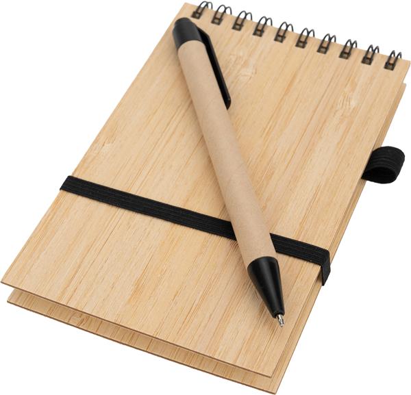 Notes o formacie A6 z bambusową okładką, zamykany na gumkę. Notes posiada 140 niezadrukowanych stron, dodatkowo wyposażony został w długopis, który dzięki pętelce przy notesie, zawsze będzie pod ręką.
