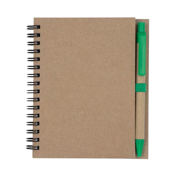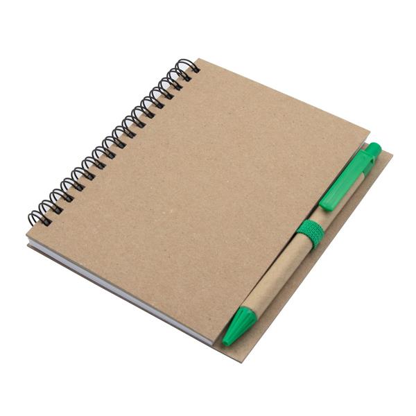 Notatnik A6 (50 kartek 80 g/m2 w linie), twarda okładka z kartonu z recyklingu, spiralne bindowanie, w komplecie długopis z trzonem z kartonu z recyklingu i kolorowymi elementami (wyprodukowany w Ukrainie / made in Ukraine)
