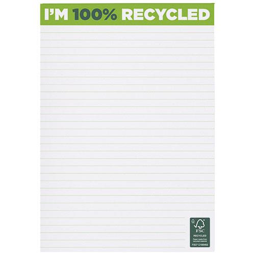 Notatnik Desk-Mate® w formacie A5 z materiałów z recyklinguModel standardowy zawiera 50 arkuszy papieru z recyklingu o gramaturze 80 g/m2. Możliwość wykonania nadruku w pełnym kolorze na każdym arkuszu. Dostępne trzy rozmiary: 25 arkuszy (21281011), 50 arkuszy (21281012) i 100 arkuszy (21281014). Długość: 21 cm Szerokość: 14,8 cm Wysokość: 0,6 cm