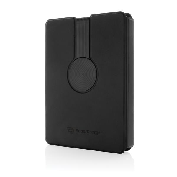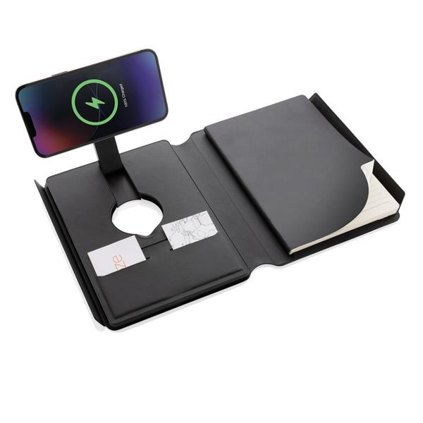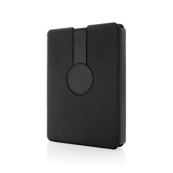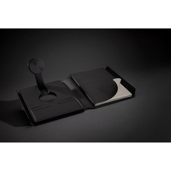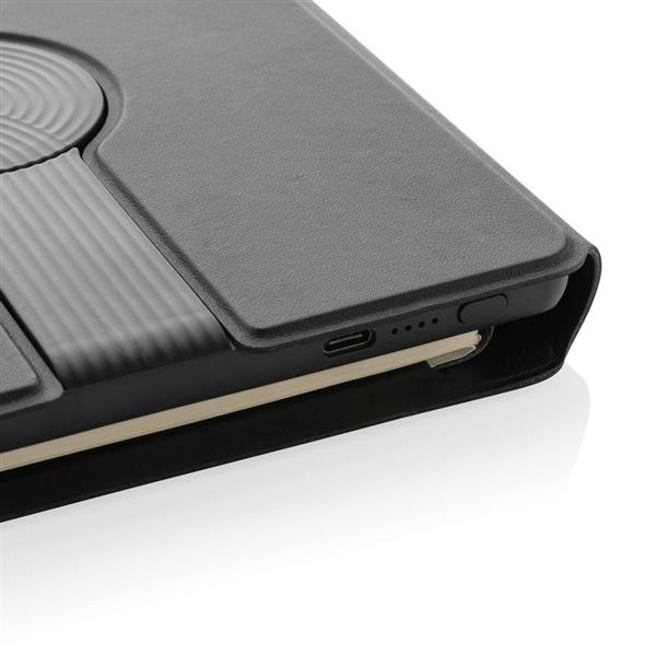 Notatnik A5 (128 kartek 80 g/m2 w linie), power bank 5000 mAh, ładowarka bezprzewodowa 10W, wykonany z PU z recyklingu z certyfikatem RCS, całkowita zawartość materiałów z recyklingu obliczona na podstawie wagi całkowitej przedmiotu: 7%, bezprzewodowe ładowanie jest kompatybilne ze wszystkimi urządzeniami posiadającymi możliwość ładowania indukcyjnego, ślad węglowy produktu: 3,99 kg CO2