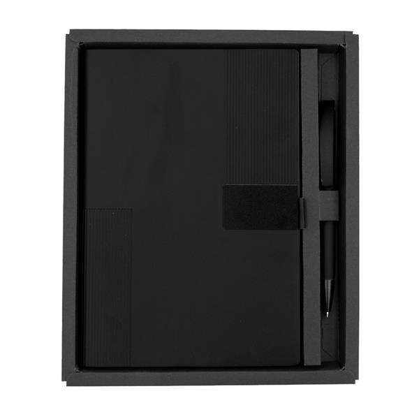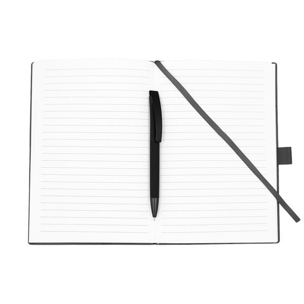 Notatnik w formacie ok. A5 posiada 80 kartek w linie (70 g/m2), tasiemka zakładkowa umożliwia wygodne zaznaczanie ostatniej strony lub ważniejszych notatek, w komplecie długopis typu „twist” z szerokim aluminiowym klipem przeznaczonym do grawerowania, przy szlufce na długopis znajduje się metalowa plakietka do grawerowania, twarda okładka wykonana z PU