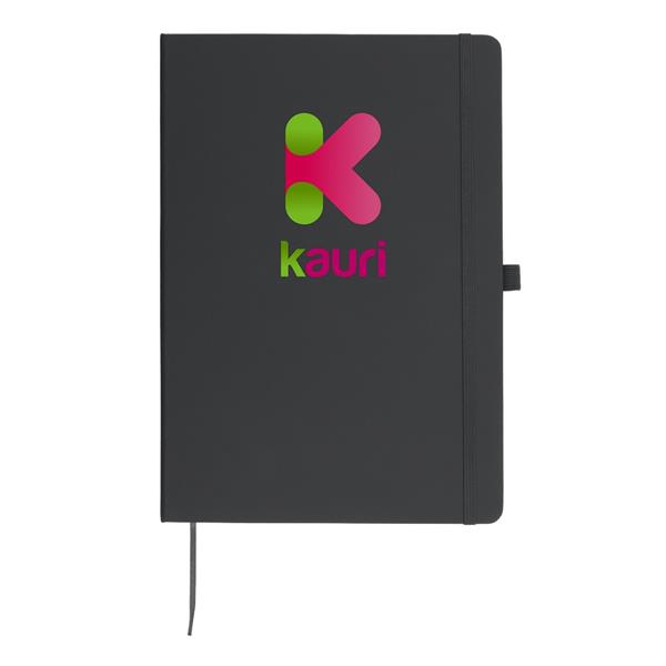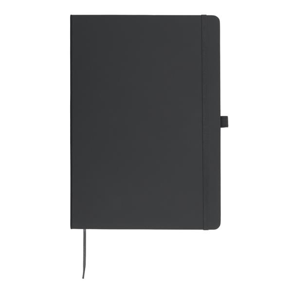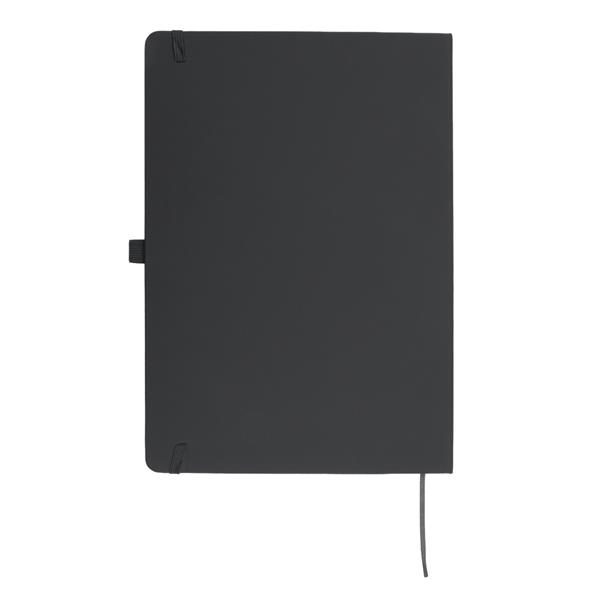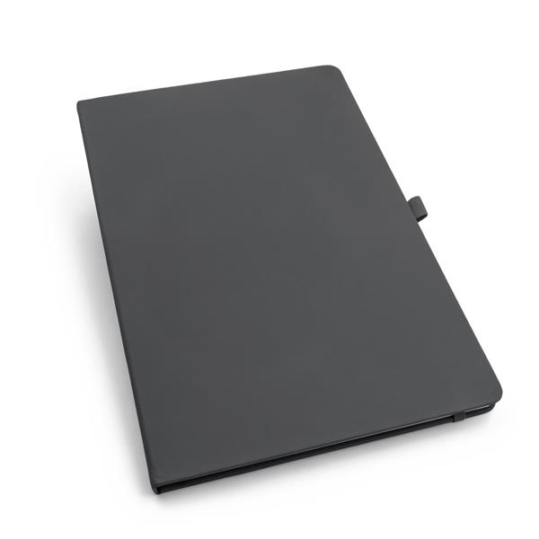 Notatnik w formacie ok. A4, posiada 96 kartek w linie (70 gsm), tasiemka zakładkowa umożliwia wygodne zaznaczanie ostatniej strony lub ważniejszych notatek, dodatkowy gumowy uchwyt na długopis, twarda okładka wykonana z PU