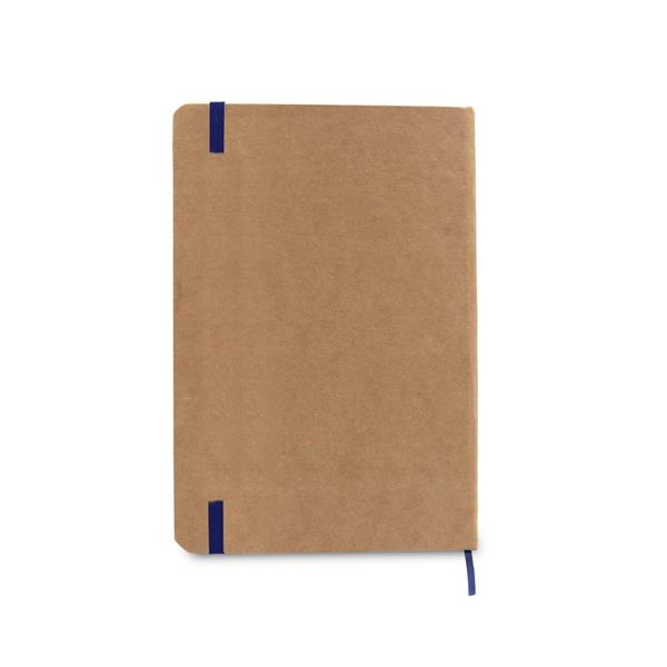 Notatnik w formacie ok. A5, posiada 96 kremowych kartek w linie (192 strony), tasiemka zakładkowa umożliwia wygodne zaznaczanie ostatniej strony lub ważniejszych notatek, dodatkowe zamknięcie w postaci kolorowej elastycznej opaski, twarda okładka wykonana z kartonu z recyklingu