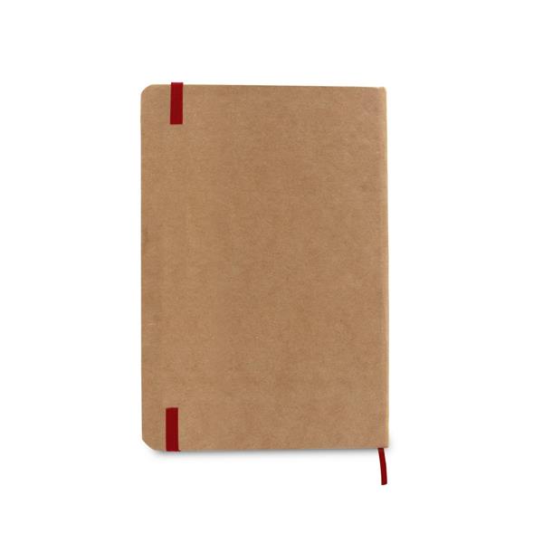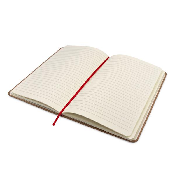 Notatnik w formacie ok. A5, posiada 96 kremowych kartek w linie (192 strony), tasiemka zakładkowa umożliwia wygodne zaznaczanie ostatniej strony lub ważniejszych notatek, dodatkowe zamknięcie w postaci kolorowej elastycznej opaski, twarda okładka wykonana z kartonu z recyklingu