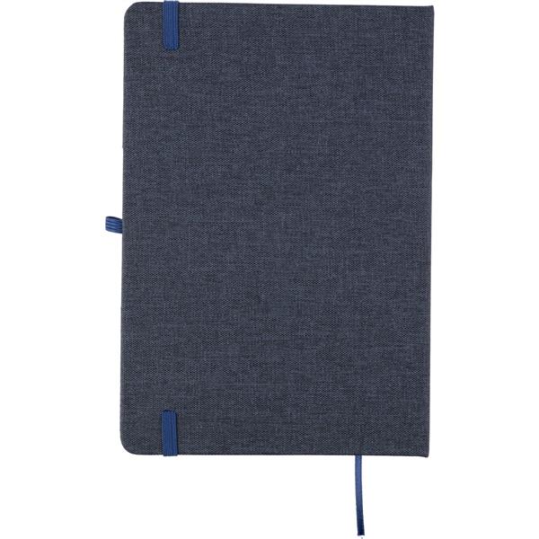 Notatnik ok. A5, posiada 80 stron w linie, tasiemka zakładkowa umożliwia wygodne zaznaczanie ostatniej strony lub ważniejszych notatek, dodatkowe zamknięcie w postaci dopasowanej kolorystycznie elastycznej opaski, składana okładka z bambusowym elementem zmienia się w stojak na telefon, zmieści się do szkolnego plecaka, produkt wykonany z RPET