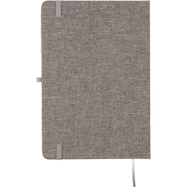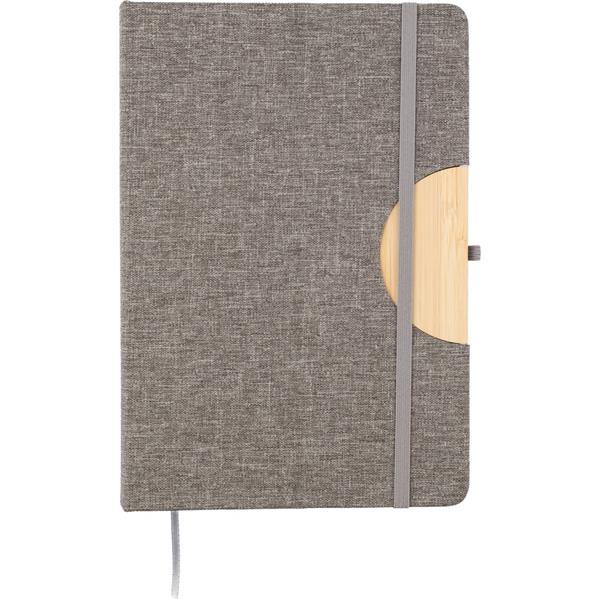 Notatnik ok. A5, posiada 80 stron w linie, tasiemka zakładkowa umożliwia wygodne zaznaczanie ostatniej strony lub ważniejszych notatek, dodatkowe zamknięcie w postaci dopasowanej kolorystycznie elastycznej opaski, składana okładka z bambusowym elementem zmienia się w stojak na telefon, zmieści się do szkolnego plecaka, produkt wykonany z RPET