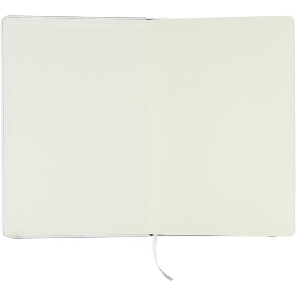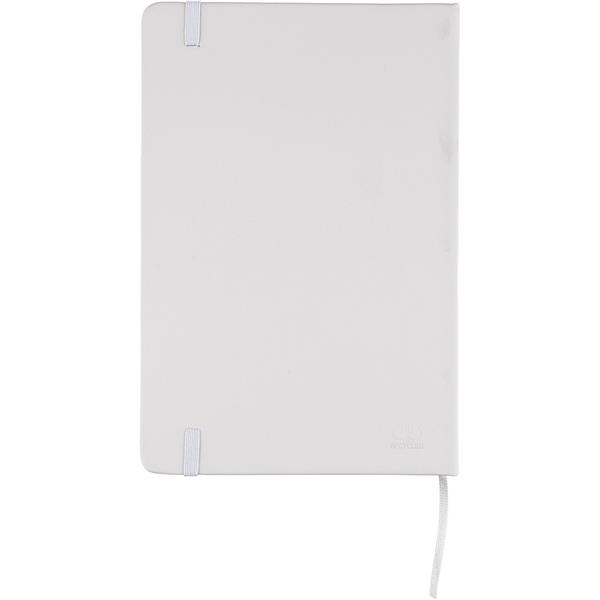 Notatnik ok. A5 RPET, z twardą okładką wykonaną z RPET PU, zawierający 80 stron w linie (70 g/m2), tasiemka zakładkowa umożliwia wygodne zaznaczanie ostatniej strony lub ważniejszych notatek, dodatkowe zamknięcie w postaci kolorowej elastycznej opaski, ikona recyklingu na tylnej stronie