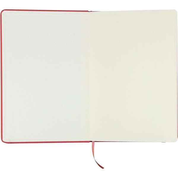 Notatnik ok. A5 RPET, z twardą okładką wykonaną z RPET PU, zawierający 80 stron w linie (70 g/m2), tasiemka zakładkowa umożliwia wygodne zaznaczanie ostatniej strony lub ważniejszych notatek, dodatkowe zamknięcie w postaci kolorowej elastycznej opaski, ikona recyklingu na tylnej stronie