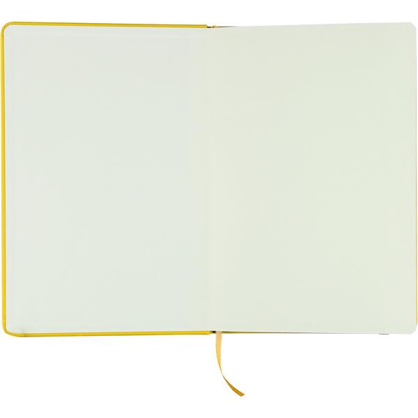 Notatnik ok. A5 RPET, z twardą okładką wykonaną z RPET PU, zawierający 80 stron w linie (70 g/m2), tasiemka zakładkowa umożliwia wygodne zaznaczanie ostatniej strony lub ważniejszych notatek, dodatkowe zamknięcie w postaci kolorowej elastycznej opaski, ikona recyklingu na tylnej stronie